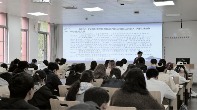 陈文泽教授以“绘就新蓝图,启航新征程”为题,围绕党的二十届四中全会精神作专题讲座。她带领同学们回顾了历届党的中央委员会全体会议的主要议程,指出科学制定并接续实施五年规划,是党治国理政一条重要经验,也是中国特色社会主义制度的显著政治优势。随后,陈文泽教授重点阐释了党的二十届四中全会最重要的成果是审议通过了《中共中央关于制定国民经济和社会发展第十五个五年规划的建议》(以下简称《建议》)。她结合《建议》的起草过程,深入解读了其中体现的科学决策、民主决策和依法决策原则,展现了党内民主和全过程人民民主的生动实践。