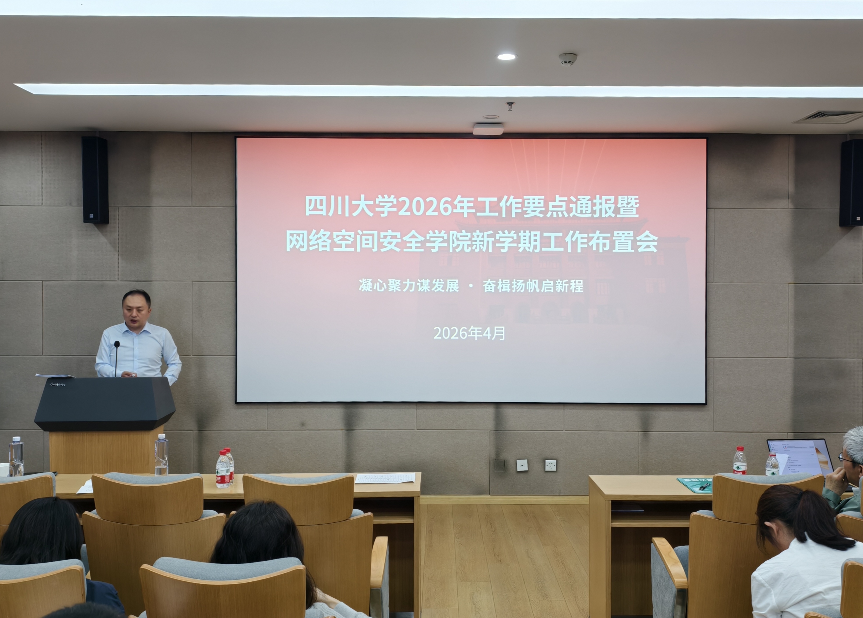 4月17日,四川大学网络空间安全学院召开全院教职工大会,专题传达学习学校2026年工作要点精神,并结合学院发展实际,全面部署新学期重点工作,会议由党总支书记雷印杰主持,领导班子和学院全体教职工参加会议。